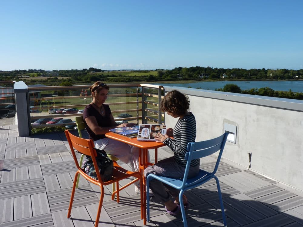 Quelle vue ! Accessible librement depuis la salle d’expositions, la terrasse de Grain de Sel est un merveilleux endroit pour se poser un peu en admirant l’anse de Séné. La terrasse est aussi le lieu de rendez-vous artistiques « haut perchés »…